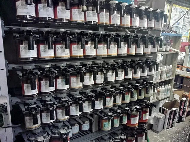 工場内には100色以上の塗料を常備したミキシングマシーンを設置しております。各メーカーが使用しているボディカラーは 解析データーで再現するので、綺麗に仕上がります。